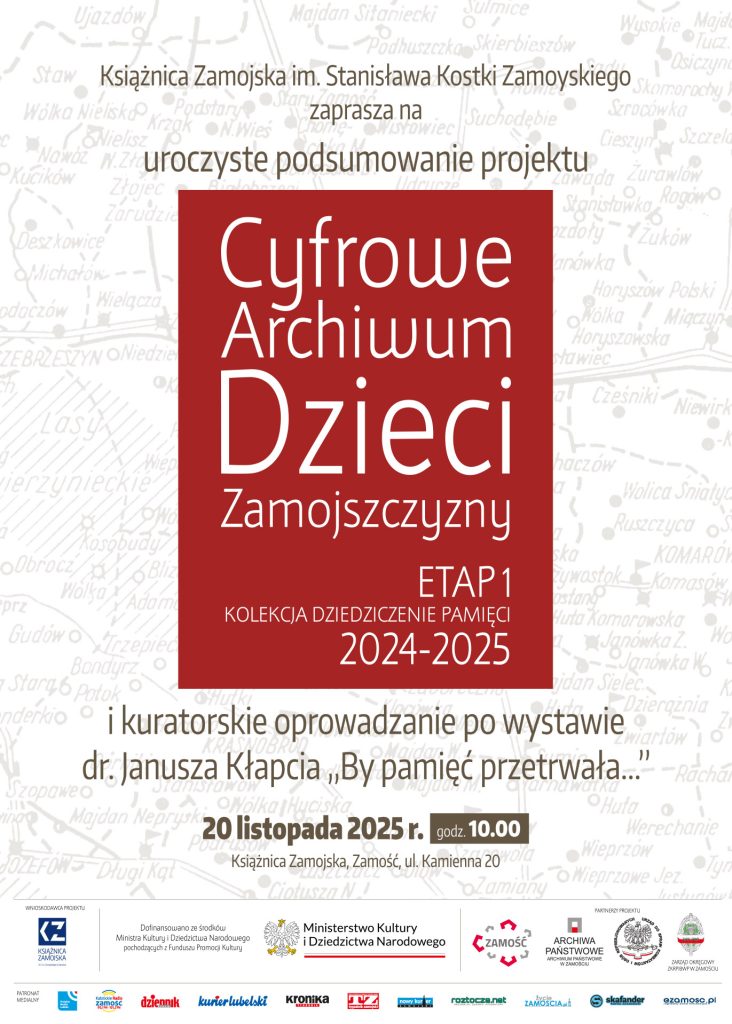 „Cyfrowe Archiwum Dzieci Zamojszczyzny. Etap 1 – Kolekcja Dziedziczenie Pamięci”, którego uroczyste podsumowanie odbędzie się 20 listopada 2025 r. o godz. 10.00 w Książnicy Zamojskiej.